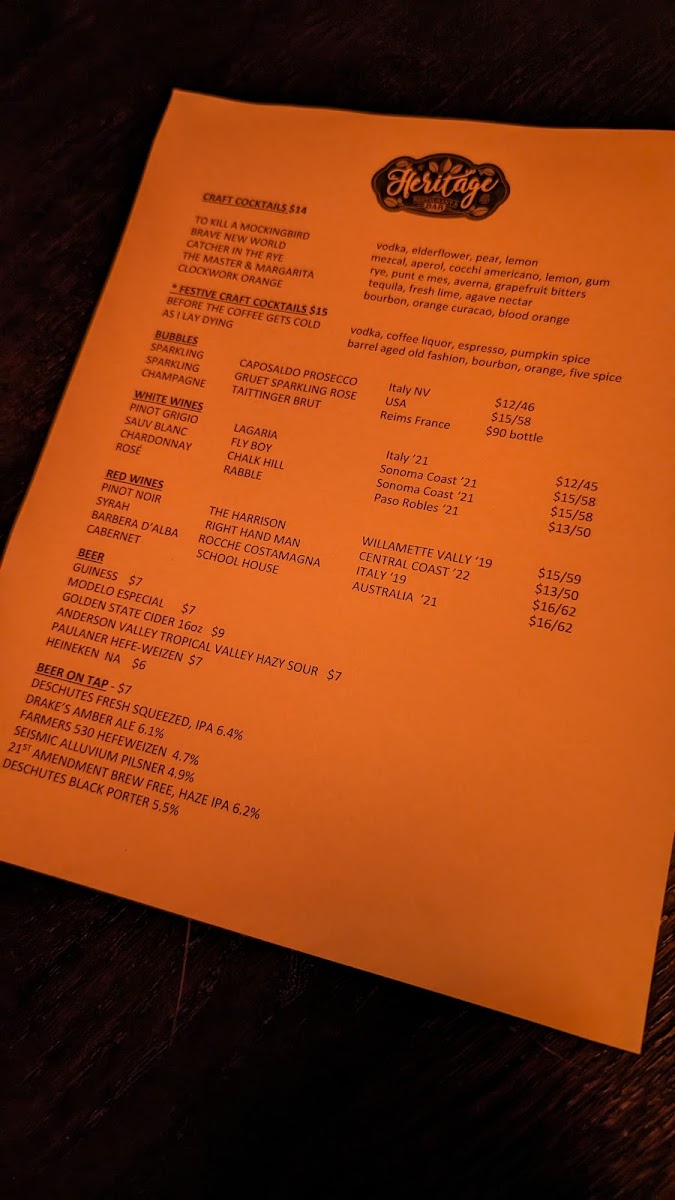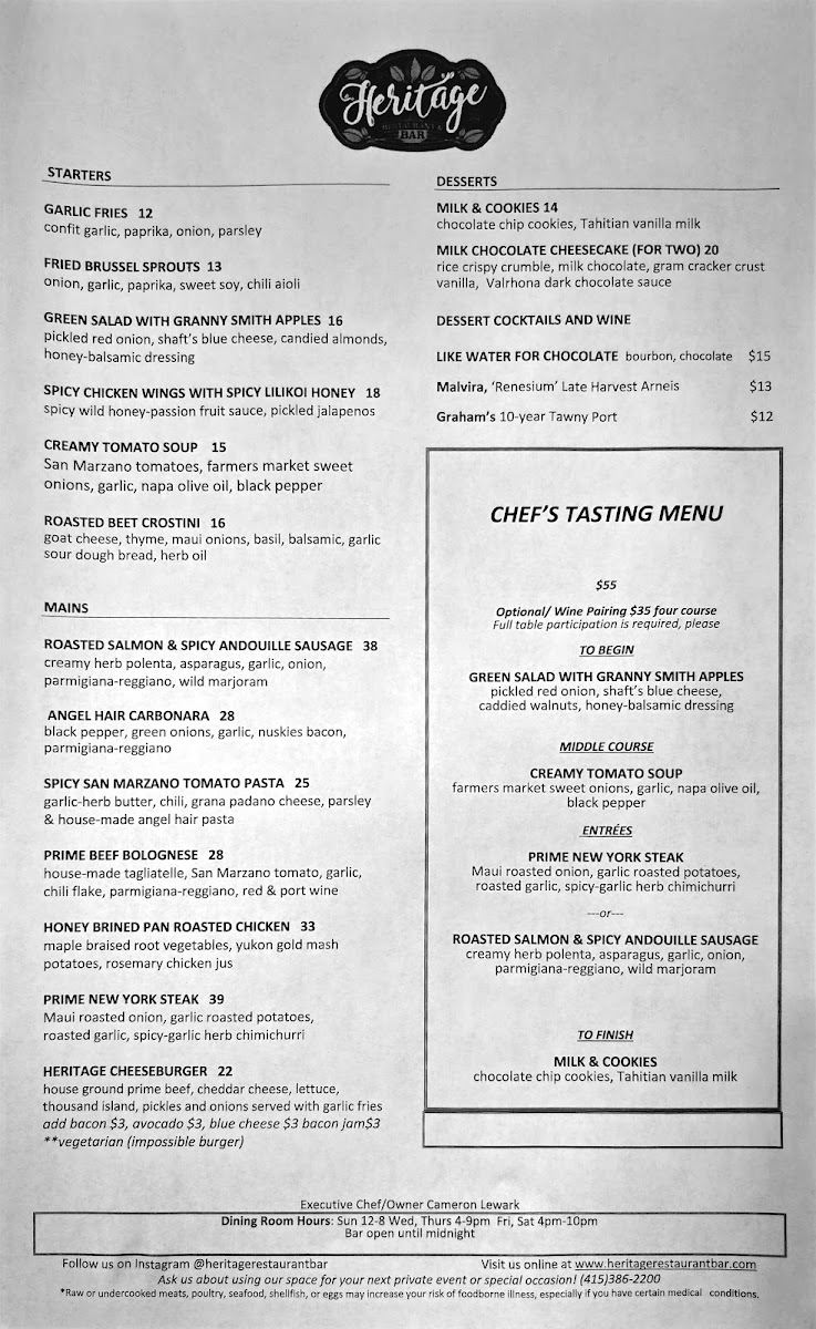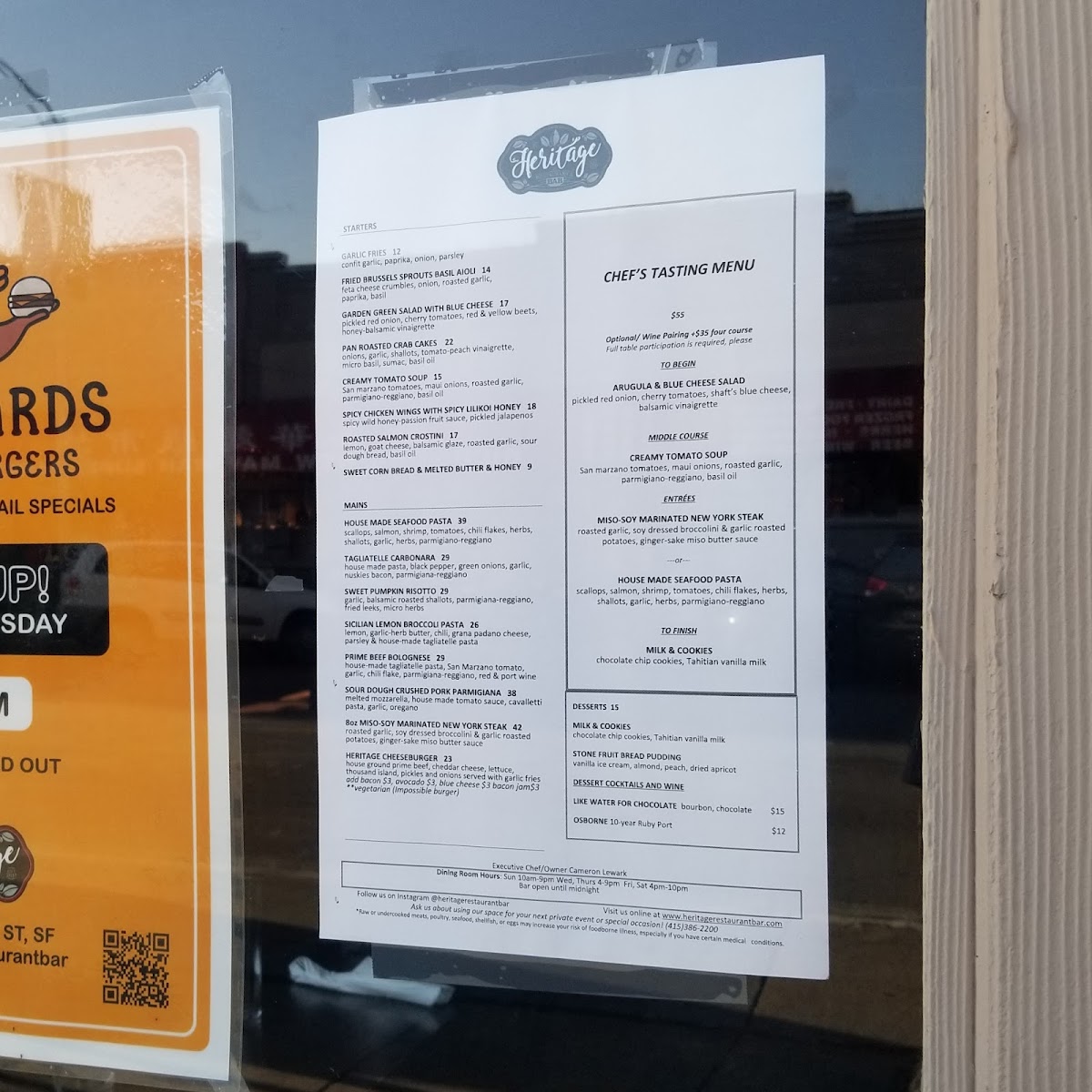 At Heritage Restaurant & Bar, located at 708 Clement St, San Francisco, CA, the menu offers a delightful array of options that cater to a variety of tastes, whether you're in the mood for a light bite or a hearty meal. For starters, you can indulge in Garlic Fries, a savory treat perfect for sharing, or try the crispy Fried Brussel Sprouts. If you're in the mood for something fresher, the Fennel-Citrus Radicchio Salad and the Green Salad with Granny Smith Apples provide a refreshing contrast. The Spicy Chicken Wings with Spicy Lilikoi Honey is an exciting option for those who enjoy a little heat with their meal.